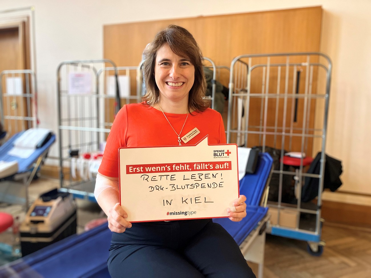 Constance Prange, 1. stellvertetende Stadtpräsidentin der Landeshauptstadt, ging mit gutem Beispiel voran und war eine der ersten Spender*innen des Blutspendenachmittages. "Tue Gutes und sprich darüber" sei ein für die Blutspende passendes Motto, so Prange. "Eine Blutspende ist mit so wenig Aufwand möglich, jeder kann sie leisten. Besonders in die Vorweihnachtszeit passt das Blutspenden doch sehr gut. Denn für Patienten bedeutet es LEBEN – was für ein Geschenk."